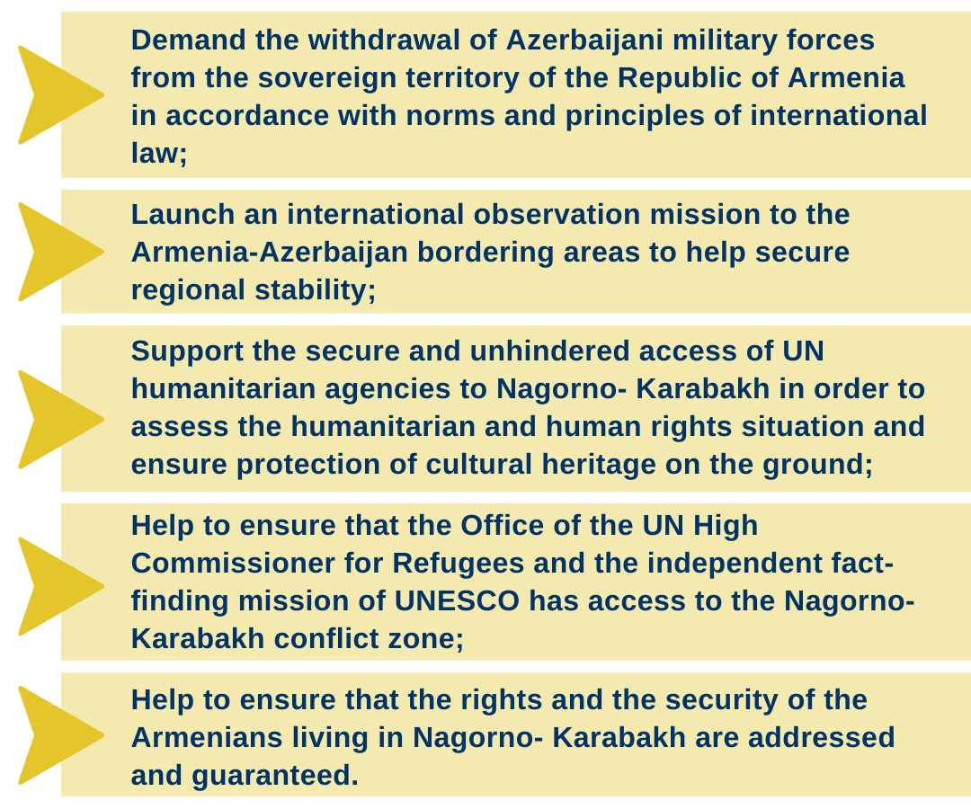 It is critical to note that this was not a border clash. It was a direct, undeniable attack against the sovereignty and the territorial integrity of Armenia, yet another flagrant violation by Azerbaijan of the Charter of the United Nations, the Helsinki Final Act, and the Trilateral Statement of November 9, 2020. Azerbaijan’s latest aggression was also condemned and addressed during the latest UN Security Council meetings and beyond.