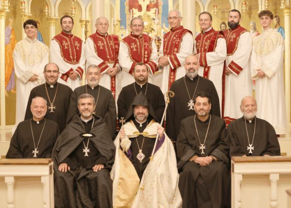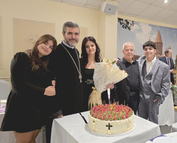 CHELMSFORD, Mass. — Parishioners of Saints Vartanantz Armenian Church recently gathered with joy and thanksgiving to celebrate the 20th Anniversary of Father Khachatur Kesablyan’s Ordination to the Priesthood. The evening began with a special “Hrashapar” worship service to welcome Bishop Mesrop Parsamyan, Primate, who was invited to bless and present Father Khachatur with a floral pilon (cope), and share a proclamation from Karekin II, Catholicos of All Armenians in recognition of Father Khachatur’s magnificent ministry. Participating clergy in the procession into the sanctuary were Very Rev. Father Nerseh Khalatyan, Rev. Father Tateos Abdalian, Rev. Father Arakel Aljalian, Rev. Father Tadeos Barsamyan, Rev. Father Krikor Sabounjian, Rev. Father Vart Gyozalian, and Rev. Father Stepan Baljian. At the conclusion of the worship service, the chairpersons of four parish organizations presented Father Khachatur with a new set of liturgical vestments for celebration of the Divine Liturgy.