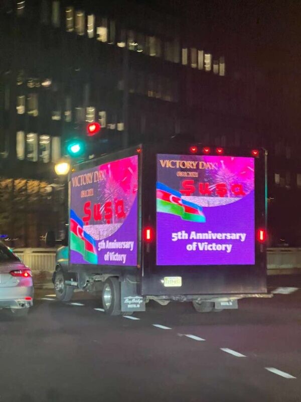 WASHINGTON — Trucks bearing signs with Azerbaijani propaganda about the 2020 war and the conquest of Shushi in Artsakh were seen Friday evening, November 8 in the streets of Washington, D. C.