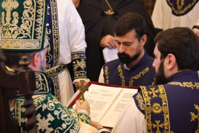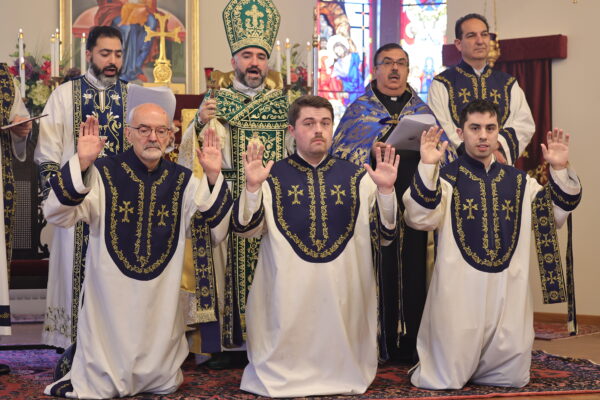 MILWAUKEE — On Sunday, November 9, Bishop Mesrop Parsamyan, Primate of the Eastern Diocese, visited Milwaukee to celebrate the 83rd anniversary of St. John the Baptist Armenian Orthodox Church. During the Divine Liturgy (Badarak), Bishop Mesrop — assisted by Rev. Fr. Guregh Hambardzumyan, pastor; Fr. Nareg, former pastor; and Deacon Sarkis Ginosyan, a seminarian from St. Nersess Seminary — ordained Arek Kashian, Michael Kashian, and David Luhrssen to the diaconate, and conferred the rank of t’bir (Acolyte) upon Eric Kashian — a milestone in the parish’s ongoing efforts to prepare and strengthen its future leaders.