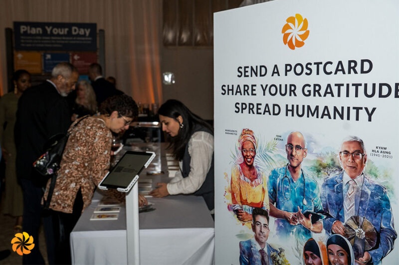 Before the ceremony, guests gathered in the Baggage Room for an immersive welcome reception. The space came alive with digital storytelling and curated activities, from signing Aurora’s Pledge to sending postcards with messages of hope. As the reception drew to a close, the guests moved to the Registry Room, followed by volunteers carrying the flags of the Aurora Prize Laureates’ and 2025 Aurora Humanitarians’ home countries, highlighting Aurora’s growing global community.