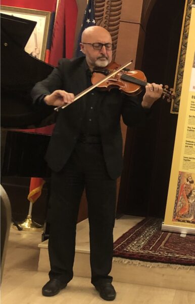The opening address was delivered by Dr. Simon Simonian, chairman of Zvartnots. He stated, “We have gathered to commemorate the memory of the Armenian composer, singer, musician-ethnographer, musicologist, choirmaster, collector of folklore, poet, pedagogue, lecturer, and one of the founding members of the first international musical society, and the prelate of all Armenian song – Komitas Vardapet.”