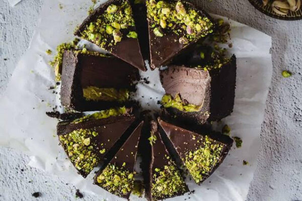 “First, if you decide to make this recipe in a 6-inch cake pan, you will create a tall, layered chocolate pistachio cake that serves at least 6 people. Each slice is so rich, you may only want a small slice. But if you use a 9-inch cake pan or tart pan, it’s shorter — therefore, it will be more like a chocolate pistachio tart. You make a no-bake chocolate crust, too — so that’s another advantage point for a pistachio tart. With the layering that happens between the base, the pistachio cream layer, and the vegan chocolate ganache, it ends up like an incredible, beautiful layered cake. I’ve decided it doesn’t really matter what you call this gluten-free pistachio chocolate creation — the most important thing is that you must taste it to believe how really good it is — while being good for you.”
