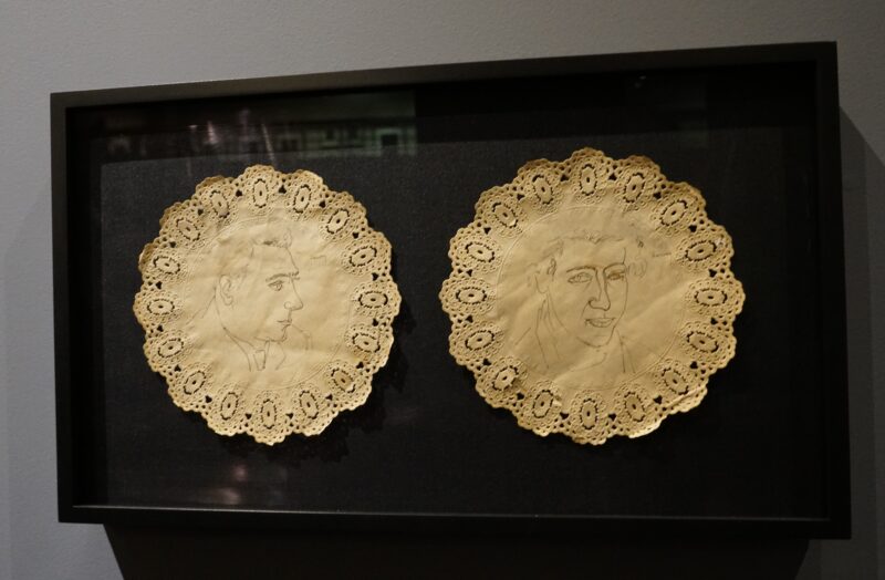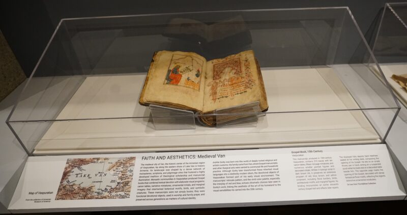 The exhibition starts with Gorky’s roots in his native Van. It displays a 15th-century illuminated manuscript, on loan from the Melikian collection, as an example of what the artist may have seen as a child, along with an embroidered outfit from 1915 which belonged to a child of Van (on loan from Adrienne Amirian) and early 20th century needle lace doilies (gifts of Vicki and Paul Bedoukian).