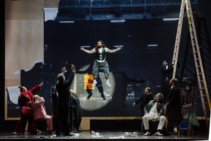 provides the stage for a multilayered procession of all players, dressed in vastly differentiated, garish costumes (everything to be found in the costume room, said Lisa Dässlaer, responsible for set and costumes), bizarre, cliché-filled, and uproariously funny. The magic of the opera has overwhelmed the environment and its players … until the fateful news arrives that the theater management has cancelled the performance and no one will be paid! The moral of the story, as the performers know, is that “Now people throughout the city will say, there is no theater any longer!”