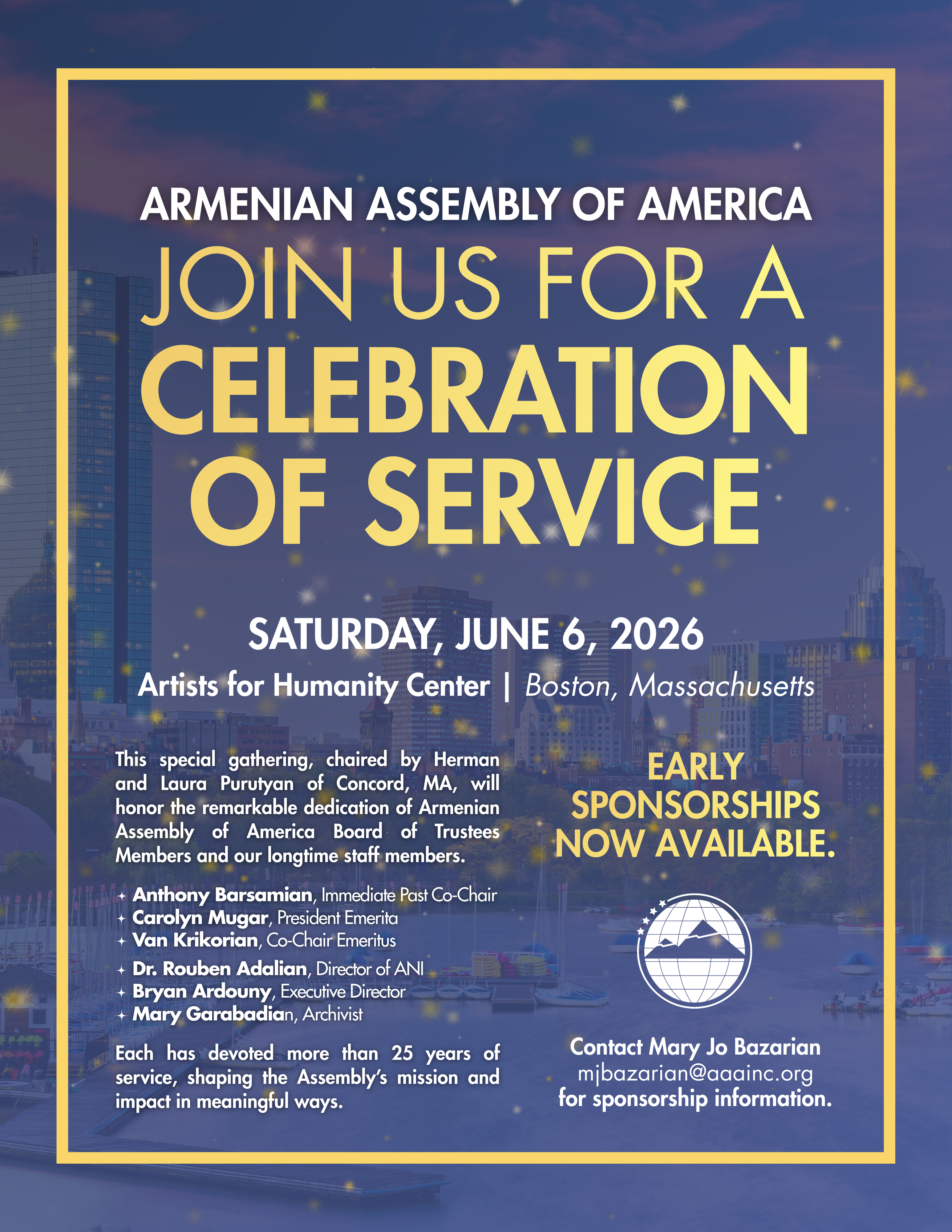 This special gathering, chaired by Herman and Laura Purutyan of Concord, MA, will honor the remarkable dedication of Armenian Assembly of America Board of Trustees Members and our longtime staff members.