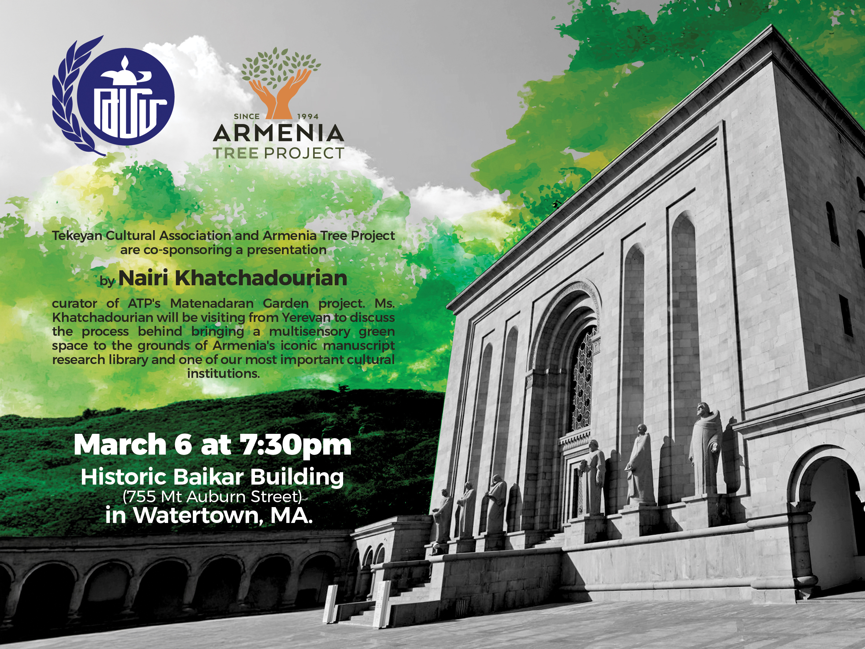 Sponsored by the Tekeyan Cultural Association of Boston and the Armenian Tree Project, Friday, 7:30 p.m., Baikar Building, 755 Mt. Auburn Street, Watertown, free admission.