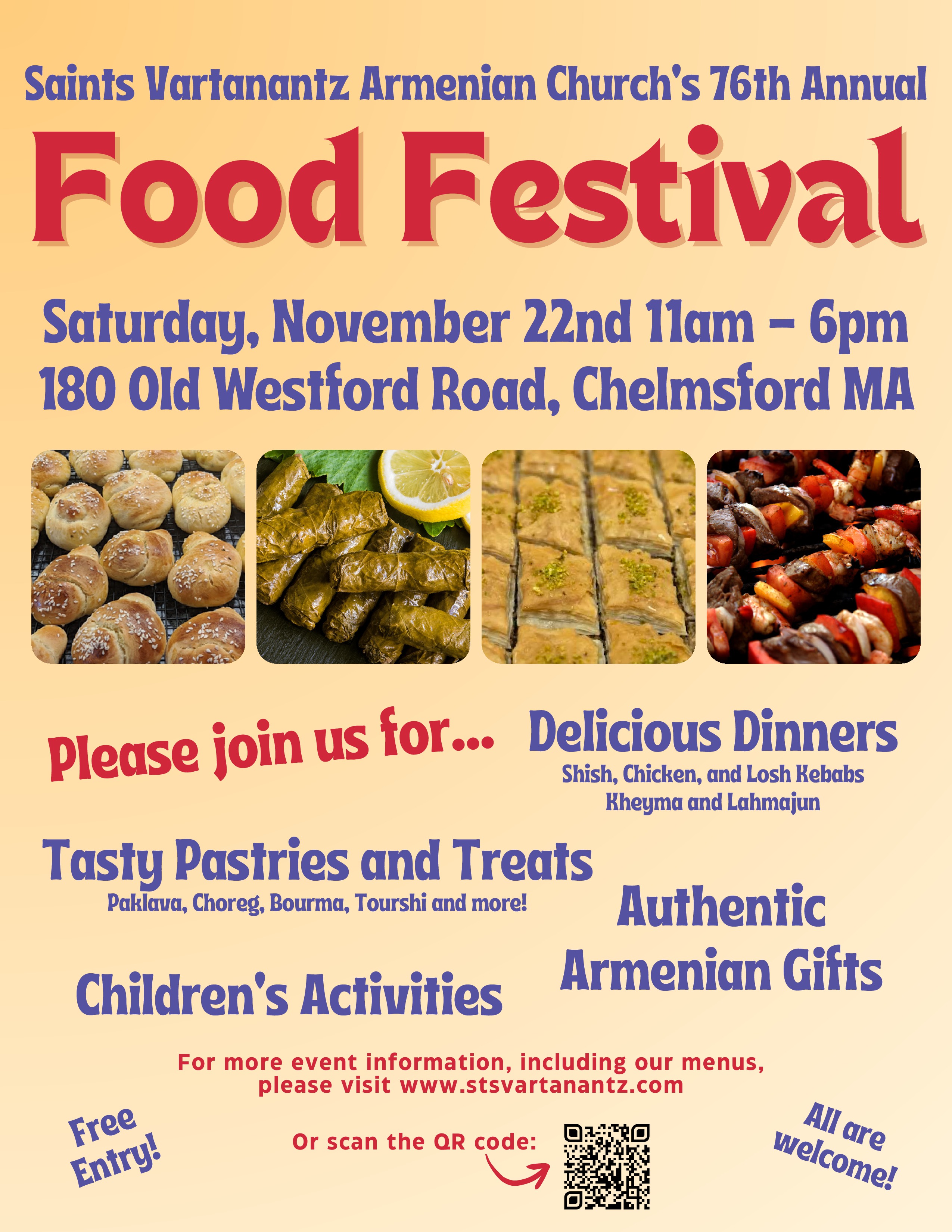Sts. Vartanantz Armenian Church Food Festival. 11 a.m. – 6 p.m., 180 Old Westford Rd., Chelmsford. Eat-in or Take-out. The Food Festival menu includes lamb, chicken, and losh kebab dinners, and a vegetarian platter; a country store with a variety of Armenian specialties and deserts. The festival also features a jewelry table, gift items from Armenia as well as a Tavloo Tournament at 1:30 p.m. For further information, see the church website, stsvartanantz.com or call the church office at 978-256-7234.