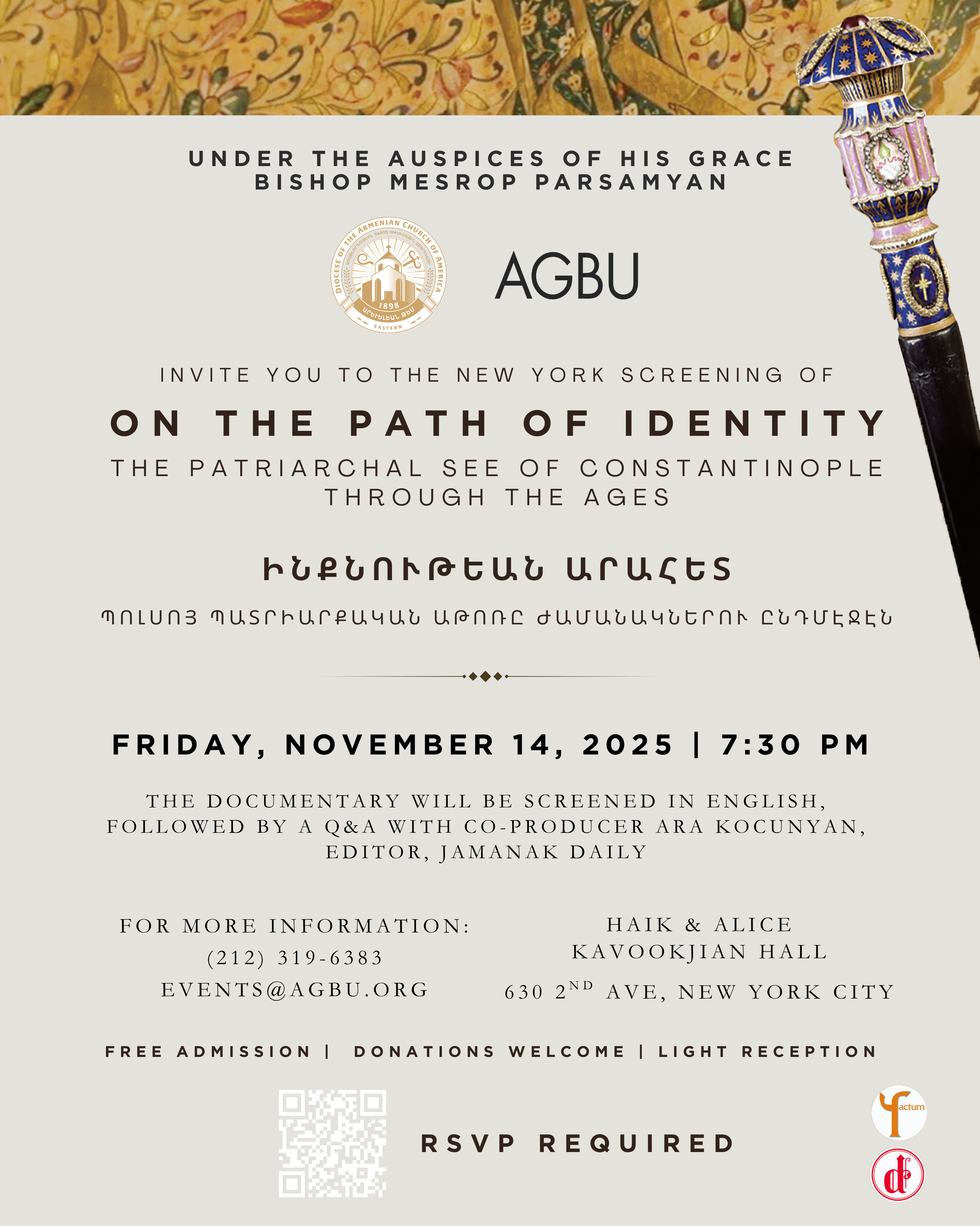 Saint Vartan Cathedral and Diocesan Center 2nd Avenue, New York, NY, United StatesAGBU and the Eastern Diocese of the Armenian Church of America invite you to the NY screening of the documentary "On the Path of Identity: The Patriarchal See of Constantinople […]