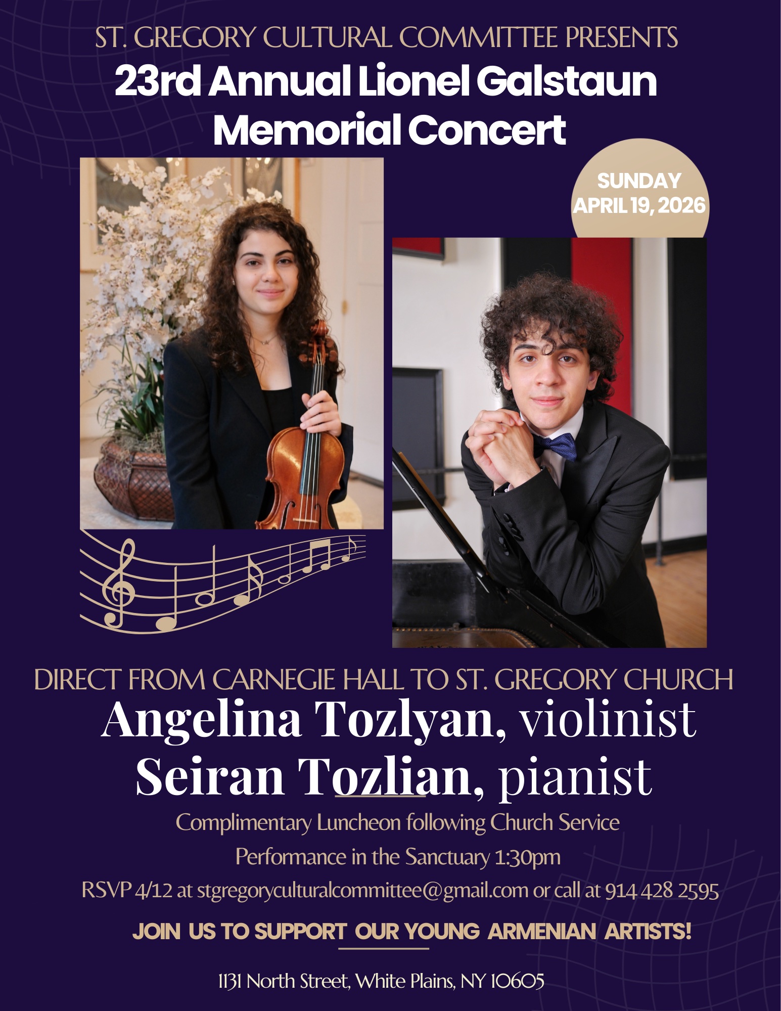 St. Gregory the Enlightener Church of White Plains, NY will hole its 23rd annual "Lionel Galstaun Memorial Concert" on Sunday, April 19, at 1:30pm at the church (1131 North St. White Plains, NY). Featuring violinist Angelina Tozlyan and pianist Seiran Tozlian. Complimentary light luncheon follows badarak. Presented by the parish Cultural Committee. Free and open […]